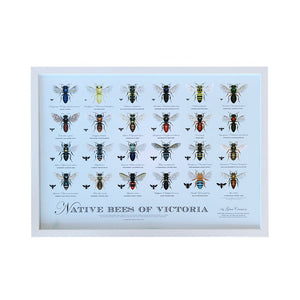 A series of superbly illustrated Native Bee posters for most Australian States and Territories showcasing the native bees of the region. With keen scientific detail, magnified diagrams and a silhouette depicting the actual size of each bee, not only are these posters a talking point for your home, but they are a thoughtful reminder of the many native insects that may call your garden home. A2 posters fits a standard A2 frame. Available posters include Native Bees of New South Wales, Queensland, Victoria, South Australia, Tasmania, Western Australia, Australian Capital Territory and the Northern Territory. Information on posters may vary with updated scientific information.