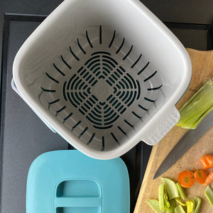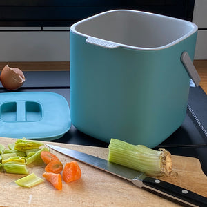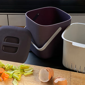 New to DiggersA benchtop compost bin to gather your food scraps before they are added to your Bokashi system or compost heaps, this elegant 4 litre bin features a removable lid that seals firmly to minimise odour, an inner drainage basket to allow moisture to gather at the base of the bin rather than fermenting food at the bottom before you are ready, and a convenient handle to get you from A to B. Available in two colours: Blue or Plum. Size: 16.5cm x 16.5cm x 17.5cm.