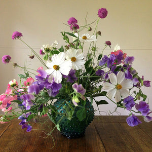 An easy selection of outstanding cut flower varieties in a palette of cool colours. Grow as stand alone for the garden and vase. This alluring colour range can echo or accompany pastel summer flowering perennials for a coherent garden. Enjoy the pleasure of sharing and admiring the wondrous results of your gardening inside and out with a bounty of cut flowers from the garden. Collection includes Cosmos White, mixed Pin Cushion Flowers, False Queen Anne's Lace and Sweet Pea 'My Navy'.