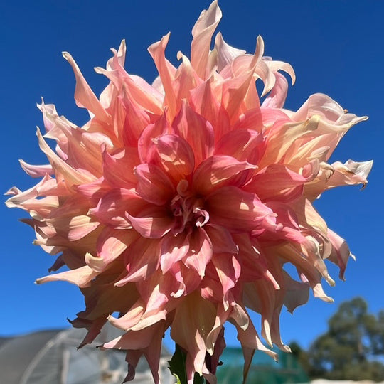 A giant decorative with huge frilly flowers. lush blooms of cream/ yellow and watermelon pink.