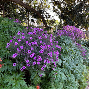 A giant geranium with large incised palmate leaves up to 25cm across, topped by a huge bronze stemmed bouquet of spectacular pink star-like flowers with dark centres and pale veins from late winter to Christmas. Perfect for creating a lush tropical look alongside New Zealand rock lilies and Plectranthus in moist areas protected from harsh afternoon sun. Biennial.