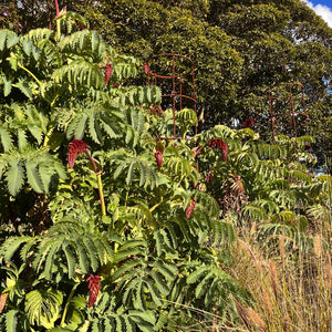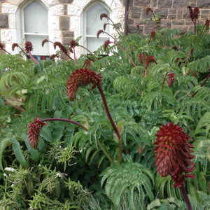 A fascinating evergreen sprawling shrub, Melianthos major creates a jungle like effect as it rambles through the garden. Large pinnate blue-green leaves with serrated edges provide architectural interest, while contrasting tall spires of reddish brown tubular flowers have an alluring honey scent that attract birds and insects. A curio of the gardening world, Honeybush makes an eye-catching creature friendly feature.