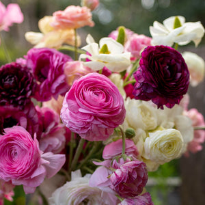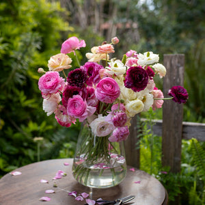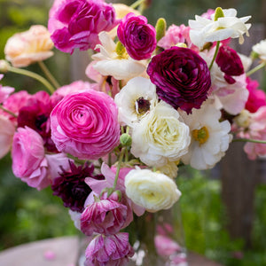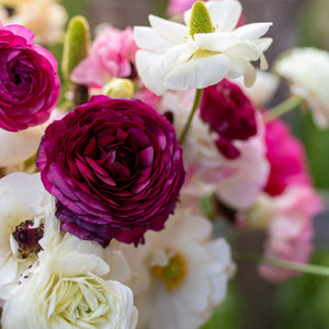 Introducing the Lady Woodland Collection – a stunning bouquet of Ranunculus flowers in soft white, delicate pink, and rich burgundy hues. This enchanting arrangement captures the beauty of the Ranunculus flower blending both elegance and charm in every bloom.