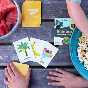 Played like regular snap, triple snap adds extra cards to the mix, encouraging children to understand the plant-to-food journey.  For example, the peanut cards show the plant, the nut shell and a jar of peanut butter. Each of these can be matched with its exact pair, or with either of the other cards in the sequence. Of course, you can also play memory and 'Go Fish' - whatever you play, have fun!