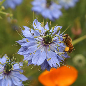 A soft flower mass that tugs at any gardening heart. One of the easiest to cultivate, it naturalises readily and flowers freely in just 8 weeks. Subtle sky-blue flowers float with a collar of thin thread-like bracts above fine plumy foliage. Intriguing ornamental balloon-shaped seed heads after flowering.