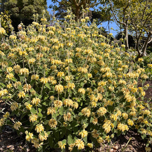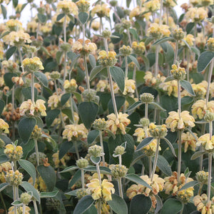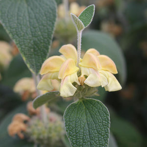 Masses of soft yellow-primrose hooded flowers, faintly blushed pink, are held in whorls along upright spires during spring and occasionally in summer. The soft felted grey-green heart-shaped leaves with softer grey edges and undersides form a dense, handsome foliage mound all year, providing a great foil for other colourful perennials. Thriving in summer with blistering heat, this Jerusalem Sage is tough, reliable and attractive to pollinators. Great on slopes or difficult, exposed positions.
