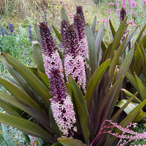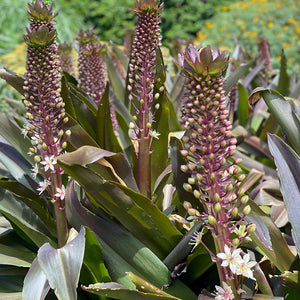 Unusual pineapple flowers top off deep purple foliage. A fantastic plant for impact and structure in the garden. Dormant in winter. Flowers in its second year.