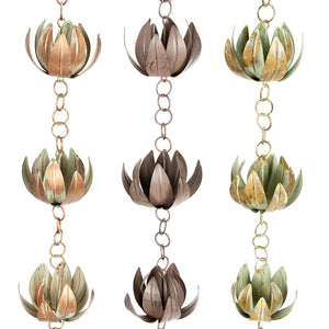 The Rain Chain Lotus is both beautiful and functional, designed to guide rainwater with style. Traditionally hung from the corner of the house, rain chains help control heavy downpours by slowing the flow of water, preventing damage to the ground below. This design is eye-catching as water cascades down the chain, turning rainfall into a feature. Assorted colours allow for variety in choice, helping you find the perfect piece for your garden. Finished in a natural brown tone, it blends effortlessly into the garden while adding a touch of elegance to outdoor spaces. Size 158cm in length, 8 Lotus flowers in chain
