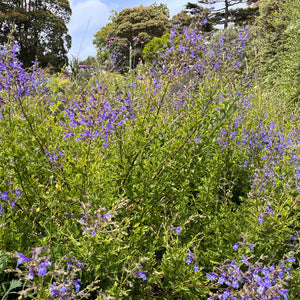 A very tough salvia tolerant of full sun, shade, coastal conditions and light frost. Exceptionally drought-tolerant and long flowering from spring through to autumn, with each 10-15cm flower stem opening gradually from the base to the tip. Aromatic light green foliage and prominent two-toned pale mauve-blue and white flowers on open upright stems. This upright salvia can be left to develop as a strong thicket, suitable as a windbreak or hedge. Attractive to bees and beneficial insects.