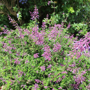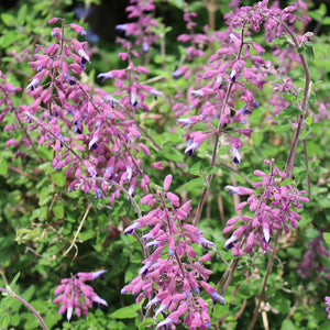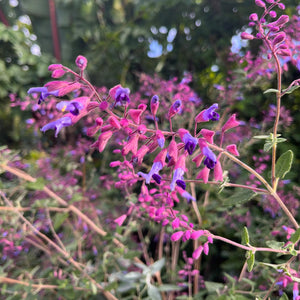 A slower-growing evergreen shrub-like salvia, semiatrata means half darkened, referring to the darker shading along the corolla tube of its mauve-lavender flowers with contrasting magenta calyces. The colourful flowers, offset against small emerald-green foliage, appear throughout the year in bursts. They peak in summer and autumn, especially if tip-pruned throughout the growing season. A perfect companion for lavenders and dwarf agapanthus and useful for a sloping bank that basks in full sun.
