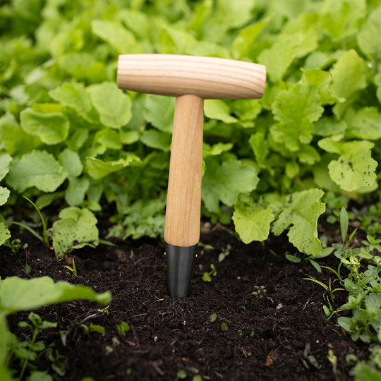 A stainless steel dibber is a gardening tool used for making holes or depressions in the soil for planting seeds, bulbs, or young plants. It is designed to be both sleek and strong, thanks to its stainless steel construction, which provides durability and resistance to corrosion. The dibber typically features a T-handle, which makes it easier to grip and apply downward pressure when creating holes in the soil.