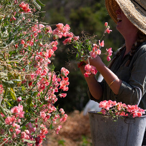 Sweet Peas prefers a sunny open position in the garden in a soil enriched with aged compost and decomposed manure. Ideally, soils should have a pH around 7 or above for optimal growth as they dislike acidic soils. Sweet Peas attach readily to any open structure that they can get their tendrils around, from simple wire fencing, to cane tepees and elaborate arbours and lattice work. It is important to set up any support before sowing or transplanting so as to avoid damaging the young seedlings as they establish. Sow seed either insitu, or in trays for transplanting. Direct sowing works very well for spring and summer sowings, while indoor sowing is best in autumn. Protect young seedlings from snails, especially during the cooler months. As they begin to flower, it is important to water regularly during dry periods and pick the flowers to prolong flowering.