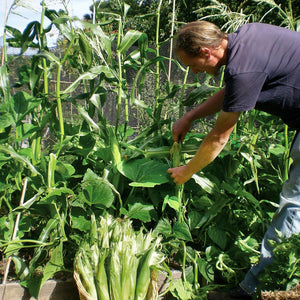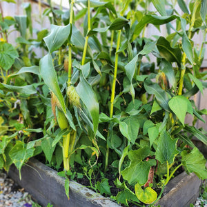 This planting combination was one of the first sustainable gardening practises developed by First American peoples. The strong stalks of the corn provide a support for the climbing beans, and in return the beans stabilise the corn in strong winds. The beans also fix nitrogen into the soil and this is then available for the corn and pumpkin. The large leaves of the pumpkin act as a mulch and so suppress weeds and prevent water from evaporating from the soil. So plant the Three Sisters today and feel connected to the gardening pioneers from many centuries ago.