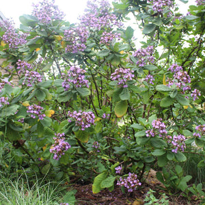 A spectacular summer-flowering plant primarily grown for its dramatic foliage and superb form, the large oval-shaped leaves are deep-green above and bronze underneath with a fine covering of tiny hairs which can inflict a mild sting. An outstanding addition to the rear of your garden, the bold foliage from 2-3.5m is topped with clusters of mauve flowers throughout summer. Originally from Central and South America, its tropical-look belies its hardiness, tolerating both extended periods of dry and frost once established. Suitable for coastal locations.
