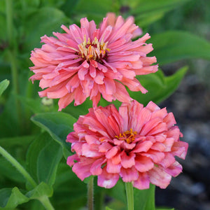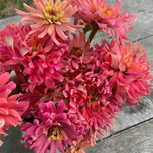 Salmon Rose makes a statement with one of the largest of the Zinnia flowers on long, sturdy stems. These double dahlia-like flowers have charming ribbon-like petals all summer long. The salmon-peach soften with age into dusky tones. This tender annual is an incredible performer in the garden or a vase.
